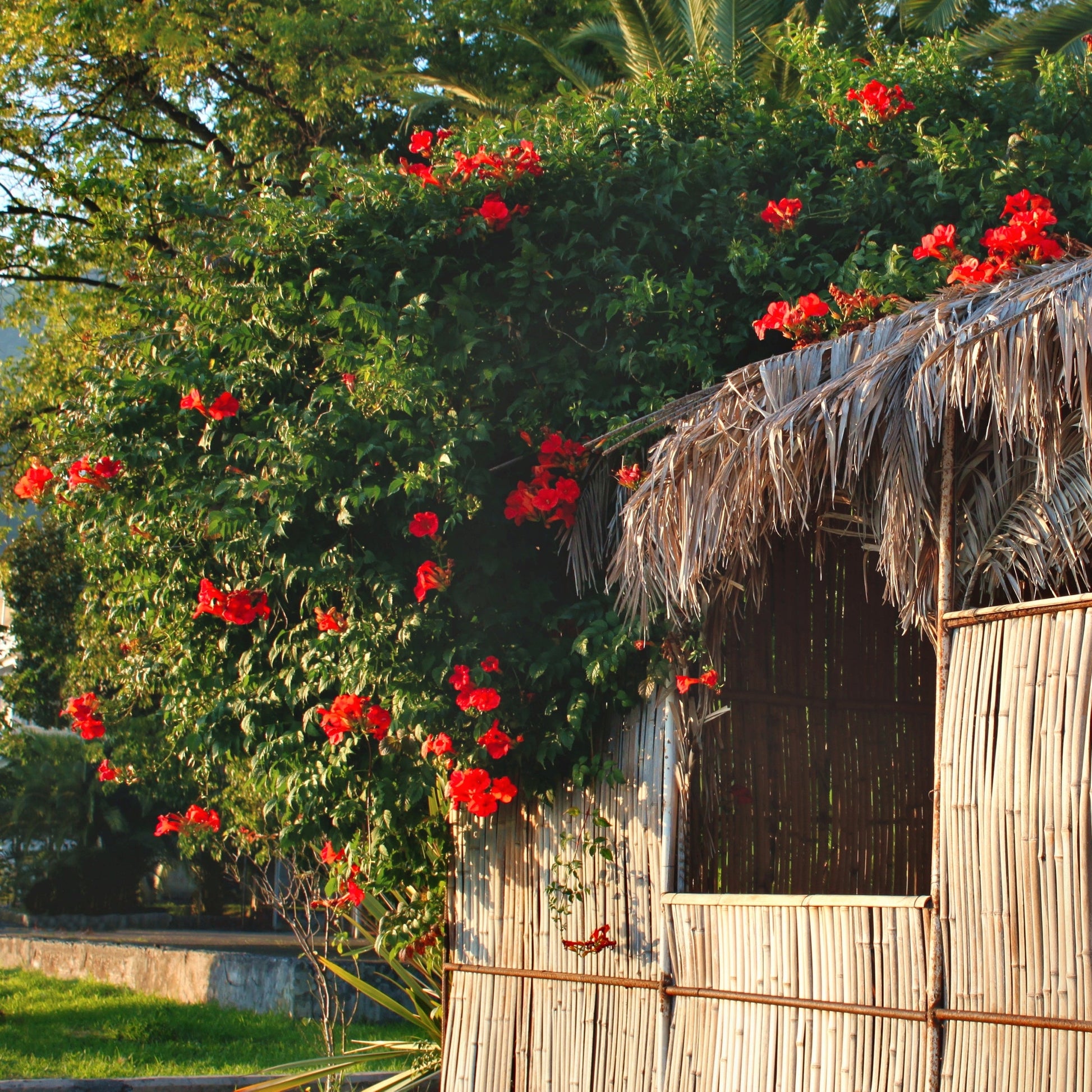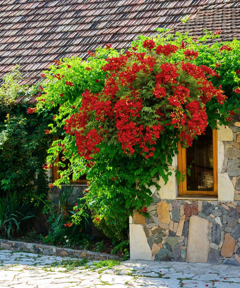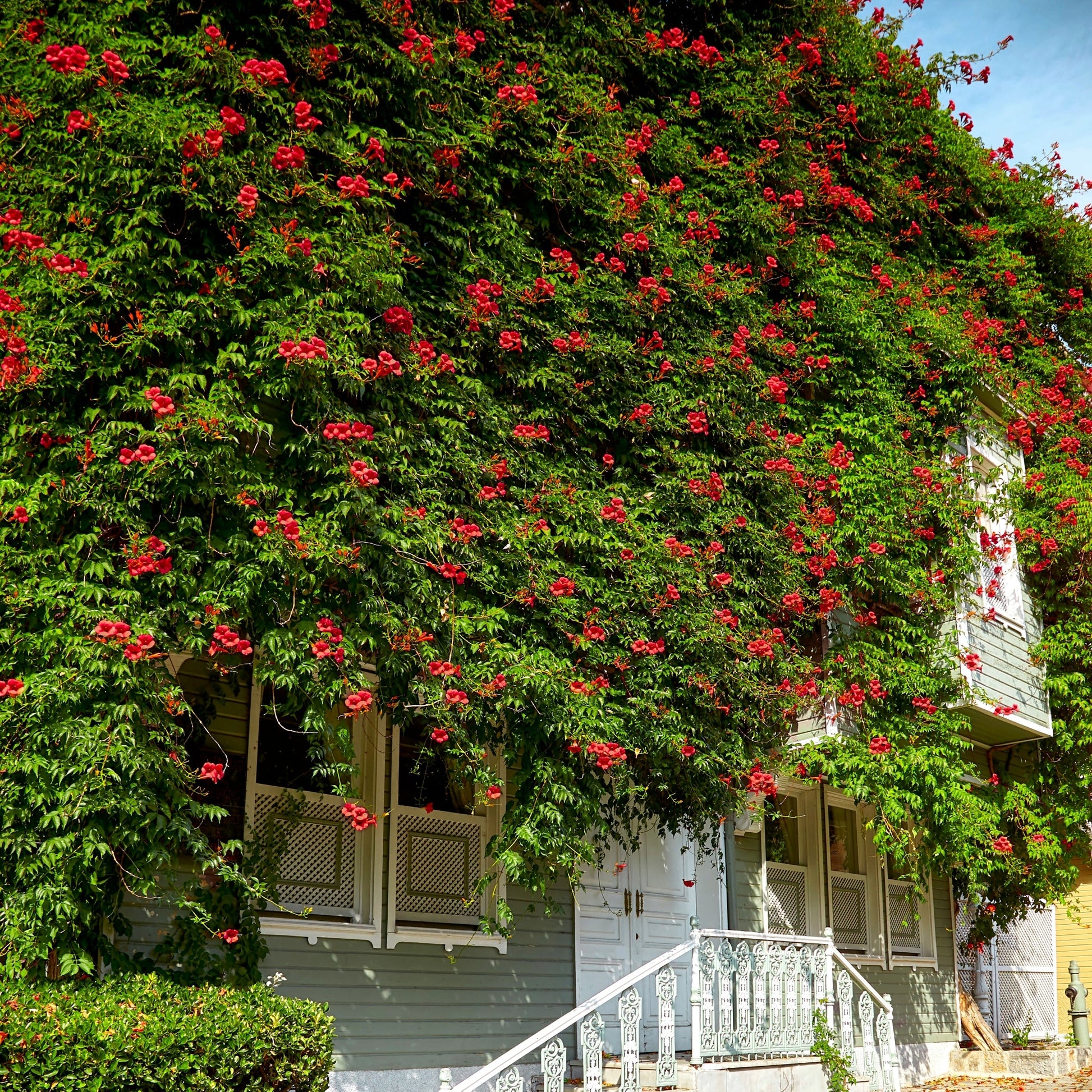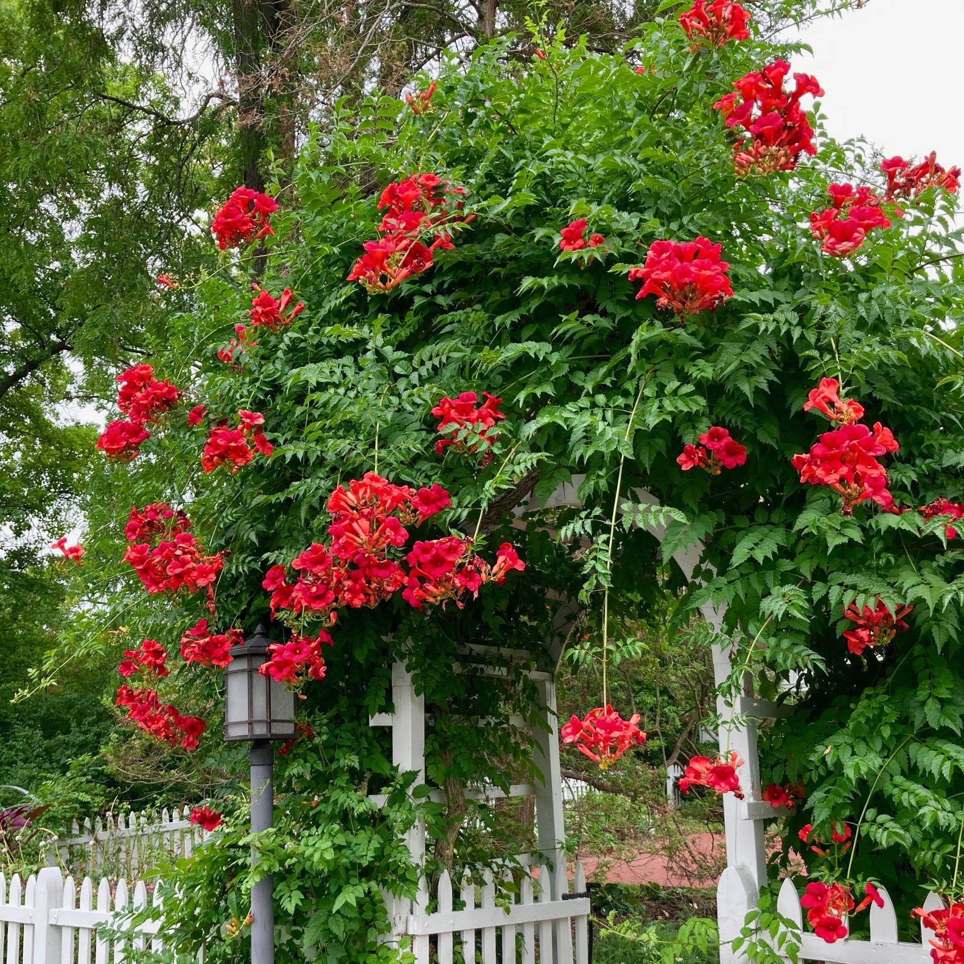 Red trumpet-shaped flowers that hummingbirds find irresistible—plant it and they will come. A vigorous climber that rewards full sun with months of color and the particular joy of watching tiny birds hover outside your window.