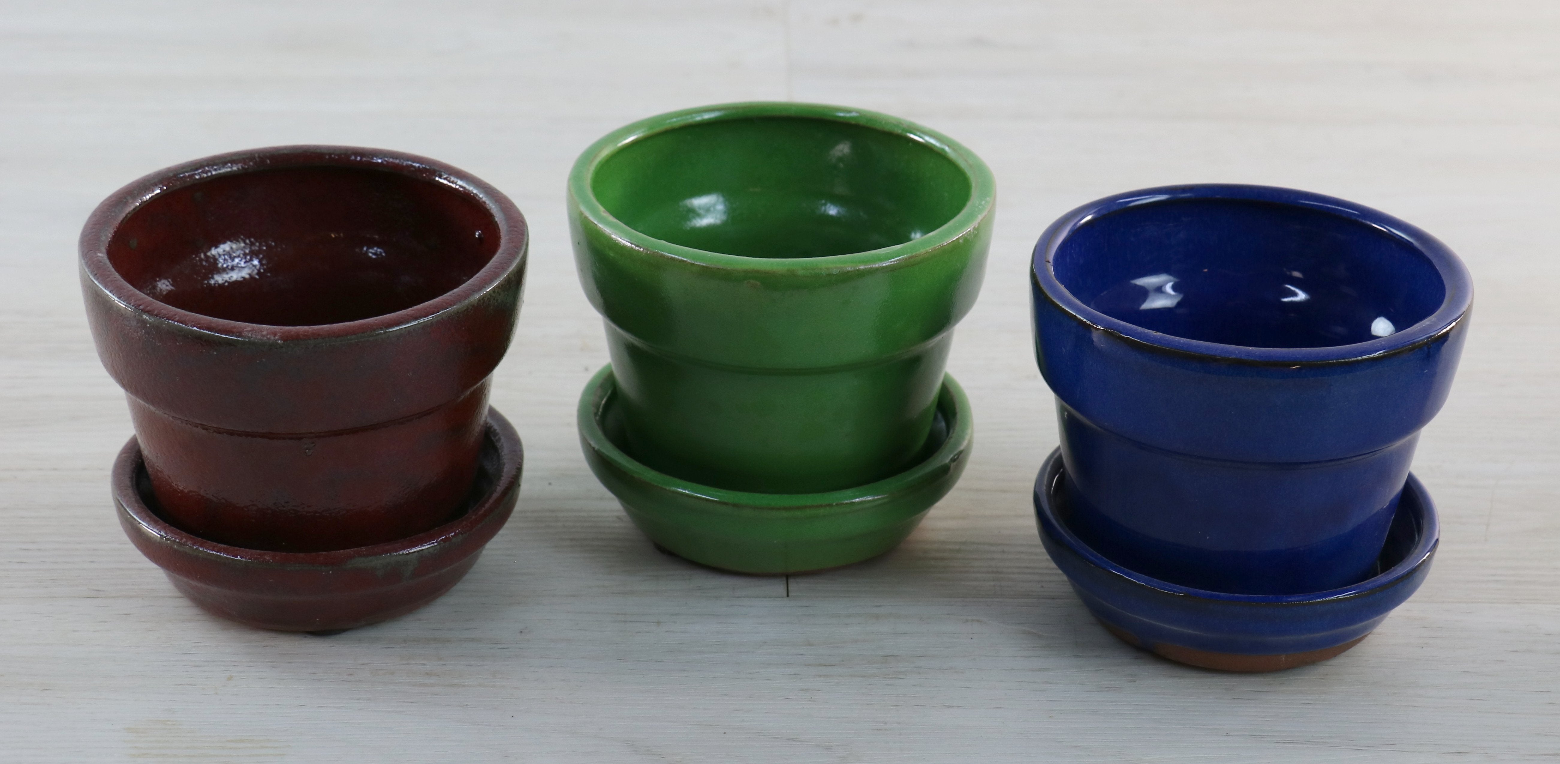 This set contains 3 assorted glazed pots. They are 3" tall / 3" across the base / 4" across the top opening.