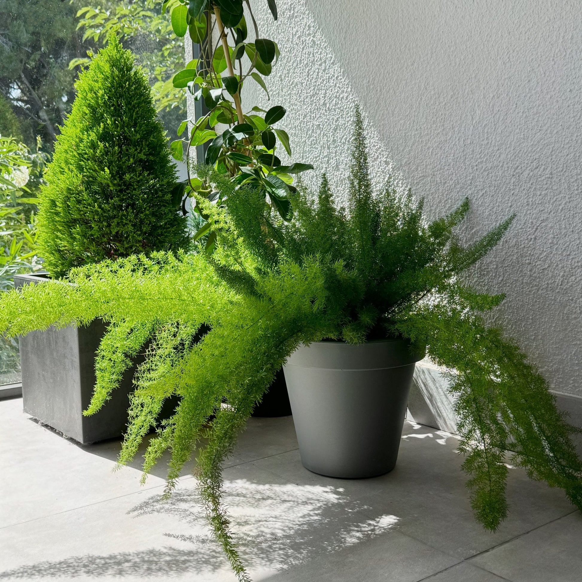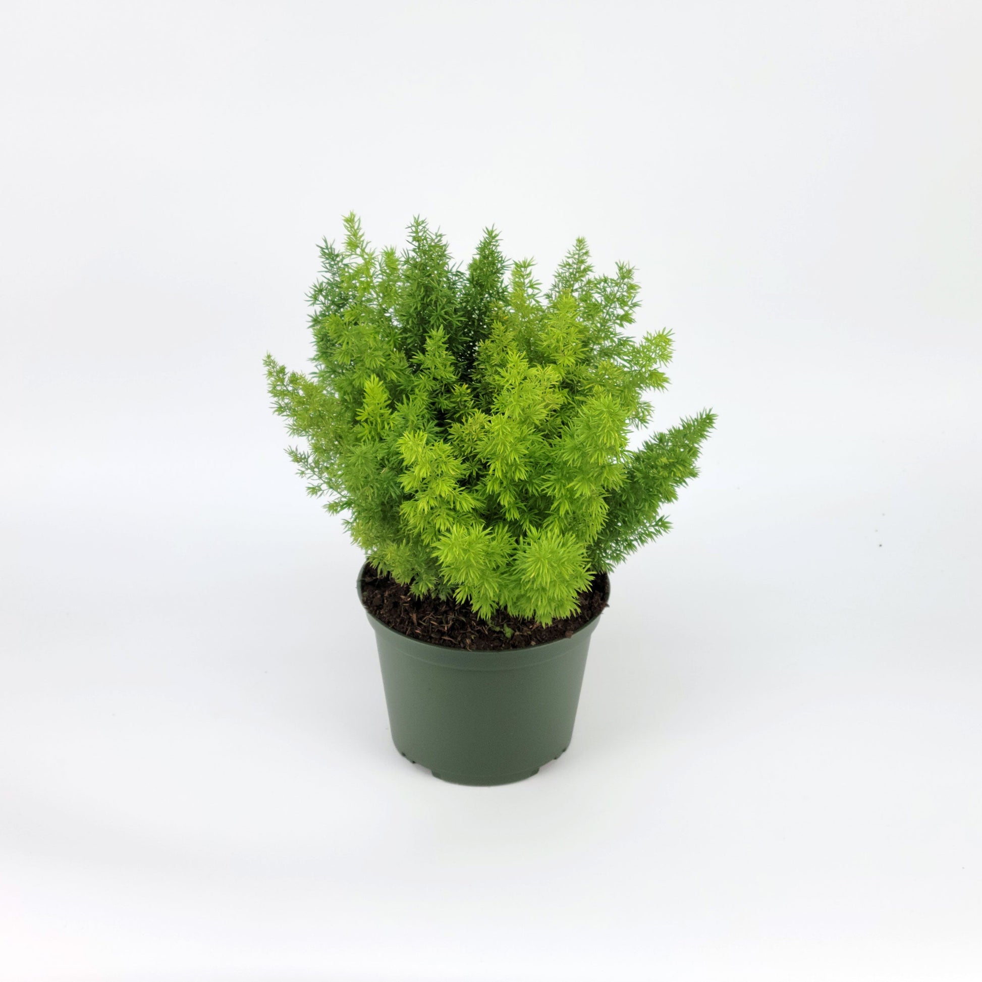 Soft, feathery fronds that arc outward like fox tails—delicate in appearance but surprisingly tough. Despite its name, it's actually part of the asparagus family, producing tiny white flowers followed by red berries. A textural beauty for hanging baskets, indoors or out.