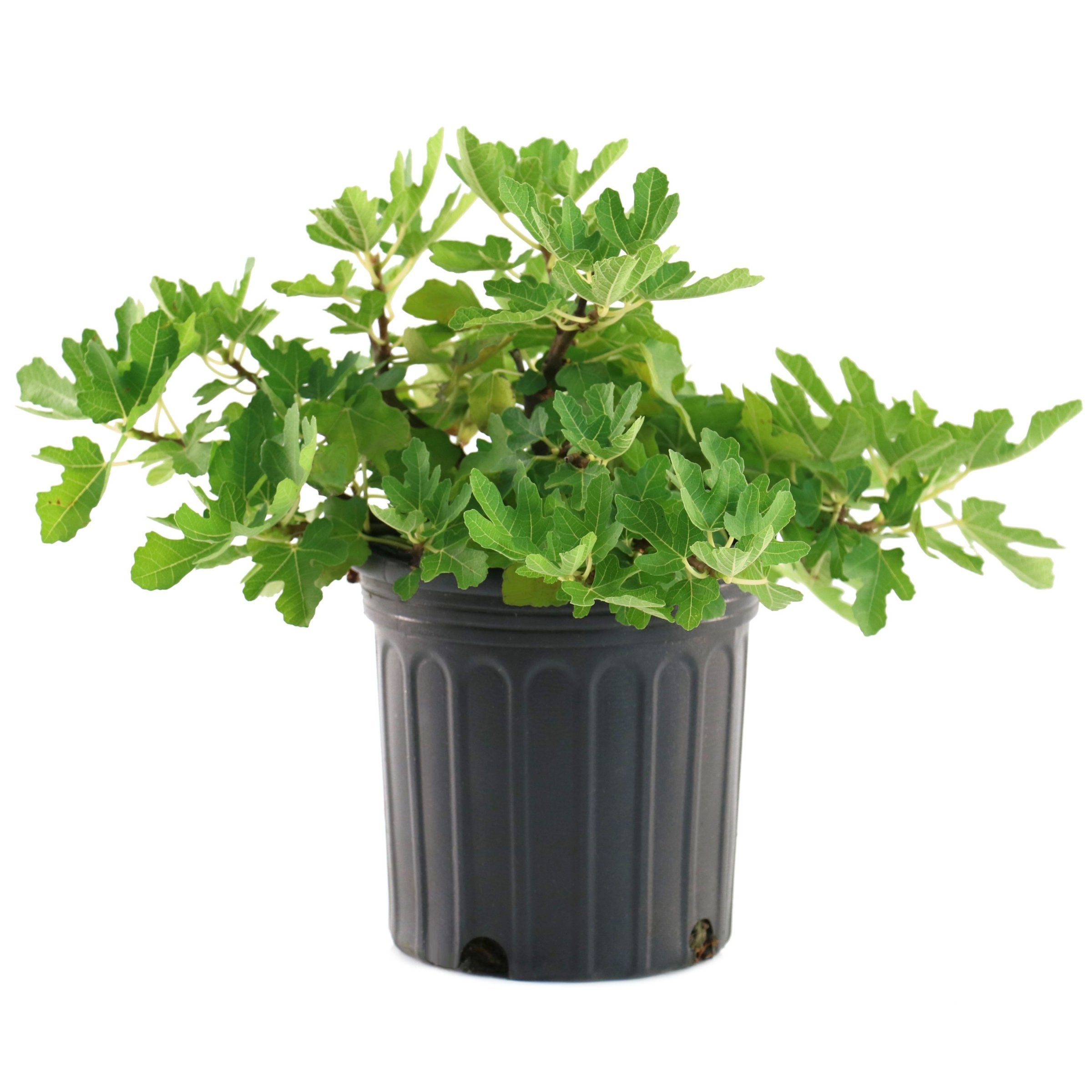 The Black Mission fig, often referred to simply as the 'Mission' fig, is a highly regarded edible fig cultivar known for its sweet, tender, and delicious fruits. This deciduous tree can range from small to medium in size and develops a highly branched, rounded shape, resembling a large bush. The tree produces high-quality edible fruits that change in color from green to reddish-purple as they ripen, revealing a strawberry pink, fleshy interior. This offer includes one plant in a trade gallon pot.