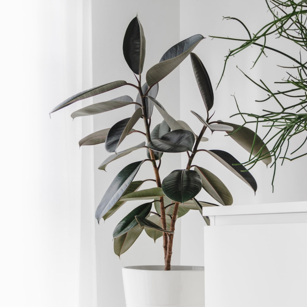 Deep burgundy leaves so dark they almost absorb the light around them—a bold, grounding presence in any room. Like other rubber plants, it quietly filters indoor air while tolerating low light and inconsistent watering. The kind of plant that makes a space feel more intentional just by being there.