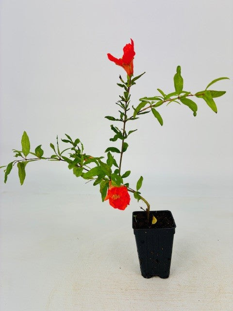 The Punica Dwarf Pomegranate, scientifically known as Punica granatum 'Nana', is a charming and versatile compact shrub that is perfect for smaller gardens or container growing. It produces vibrant, trumpet-shaped flowers in an orange-red hue from late spring to early summer, attracting a variety of pollinators. The shrub features glossy green leaves that provide a lush backdrop for both its blooms and fruit. In colder climates, the deciduous leaves turn an attractive yellow before falling off for the winter. Typically, this dense, rounded shrub reaches a height and width of 2 to 4 feet, though it can occasionally grow up to 6 feet tall. It thrives in full sun to partial shade and prefers well-drained soil. Once established, it shows moderate drought tolerance, but regular watering during the flowering period will enhance fruit production. Includes one actively growing plant in a trade gallon grow pot.