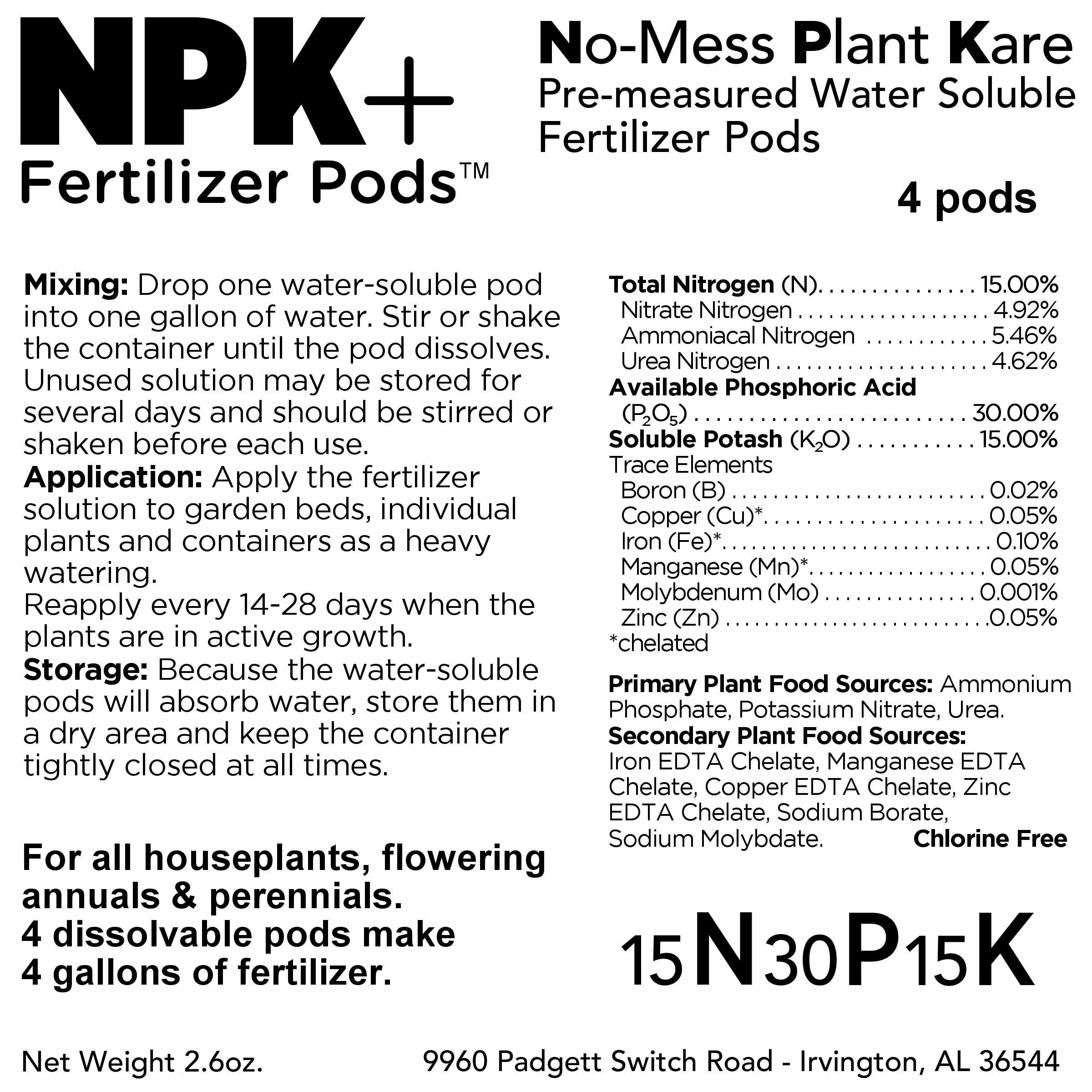 Our No-Mess Plant Kare™ Fertilizer Pods take the guesswork (and the mess!) out of feeding your plants. Each dissolvable pouch is pre-measured with the optimal blend of organic Nitrogen, Phosphorus, and Potassium that your plants need for strong growth, lush foliage, and vibrant blooms. Just drop one pod into a gallon of water, give it a quick stir or shake, and water as usual. That's it! No spills, no measuring, no hassle. Feed every two to four weeks for stunning results all season long.