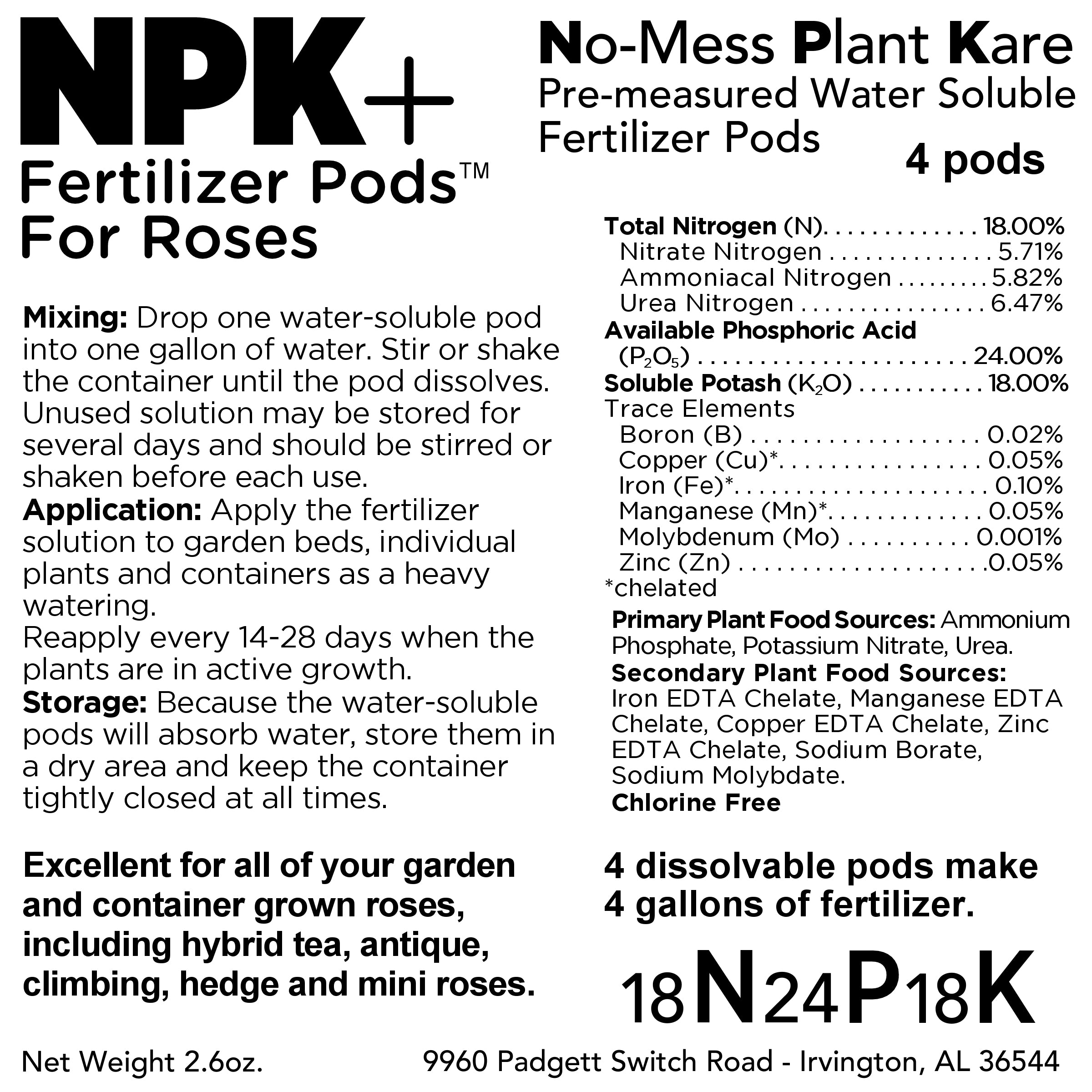 No mess, no guesswork - just the nutrients your roses need to bloom beautifully. Each dissolvable No-Mess Plant Kare™ Fertilizer Pod contains the ideal blend of Nitrogen, Phosphorus, and Potassium, plus rose-friendly micronutrients for exceptional results. Perfect for all roses: tea roses, climbers, floribundas, and container roses alike!
