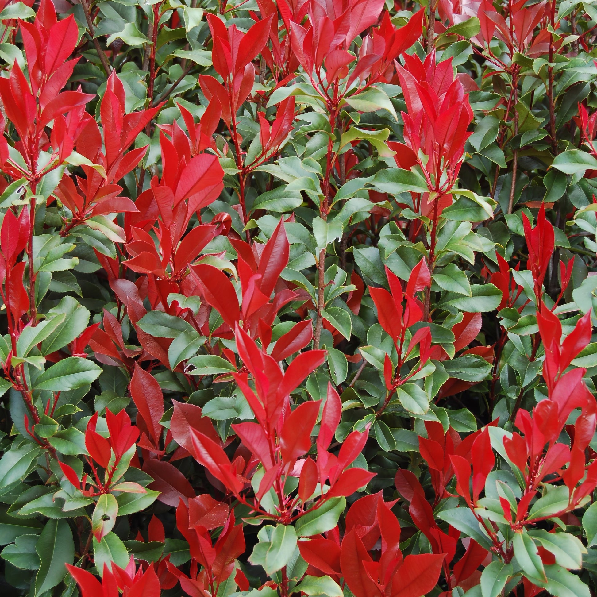 Photinia ‘Dynamo Red’ is a vibrant evergreen shrub prized for its bold, fiery red new growth that deepens to glossy green as the leaves mature. Its compact, dense habit and year-round color make it an eye-catching choice for hedges, screens, and foundation plantings.