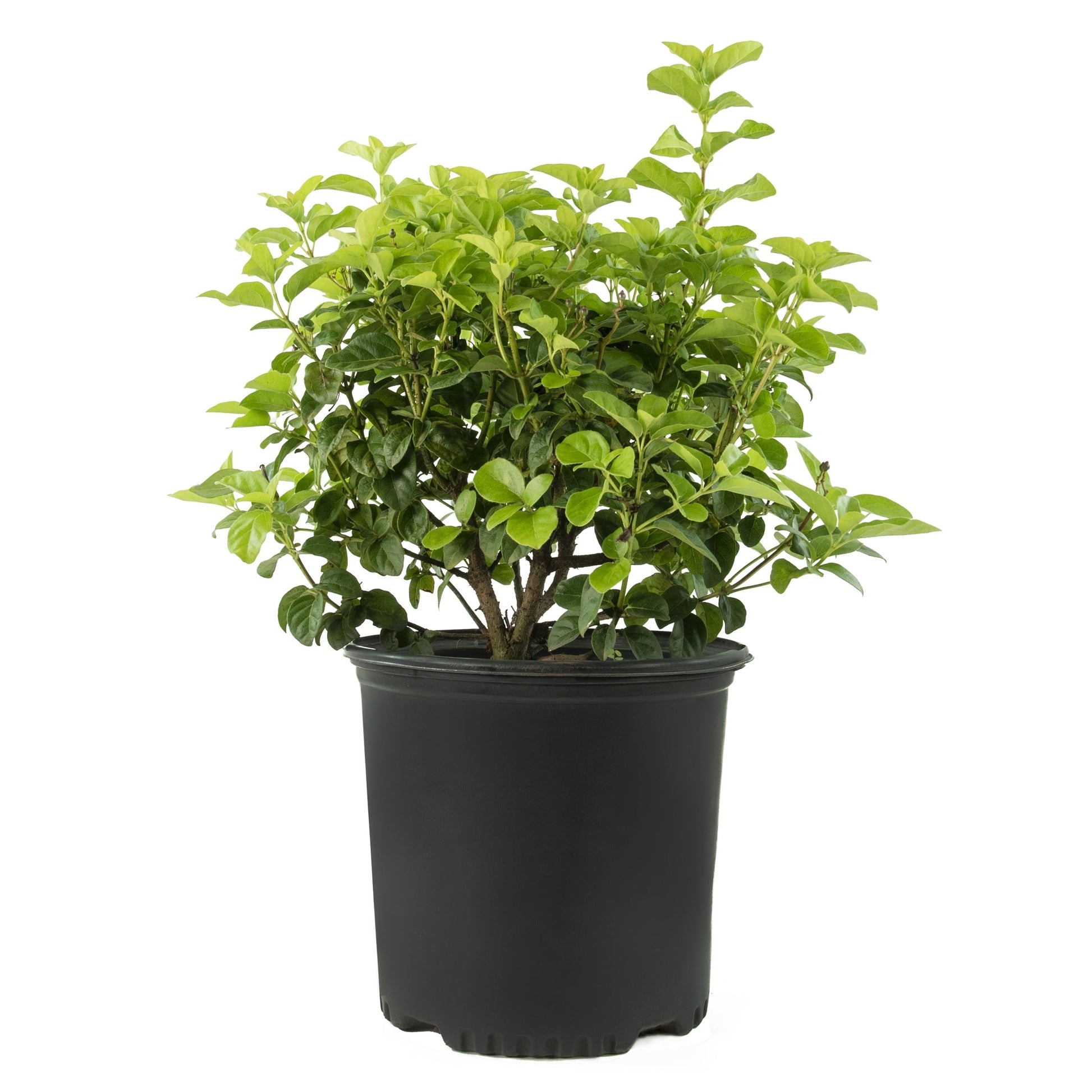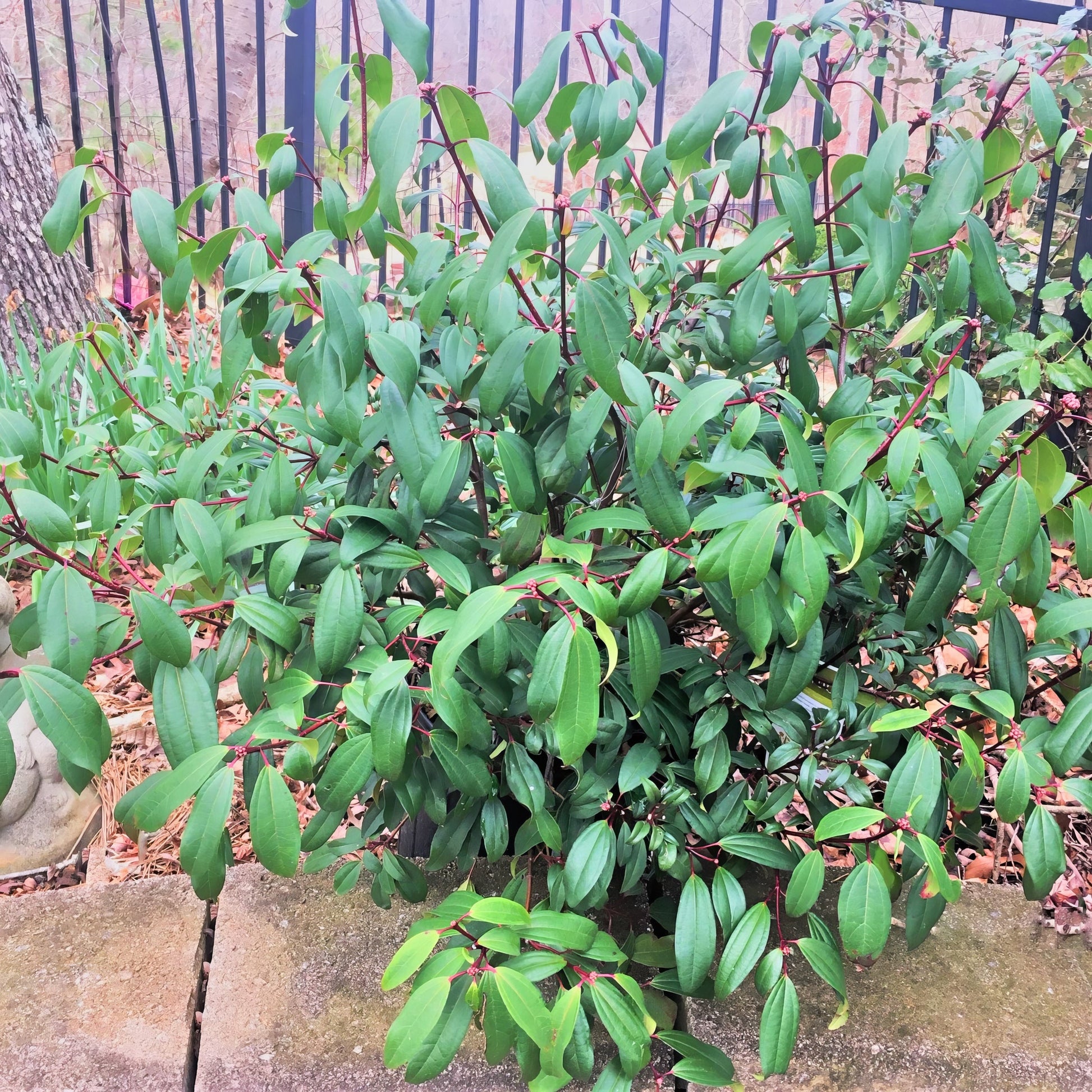 Dark glossy foliage and burgundy stems, with delicate white lace-cap flowers in spring. Deer-resistant and drought-tolerant once established—a refined evergreen for hedges, borders, or mass plantings that earns its keep year-round.
