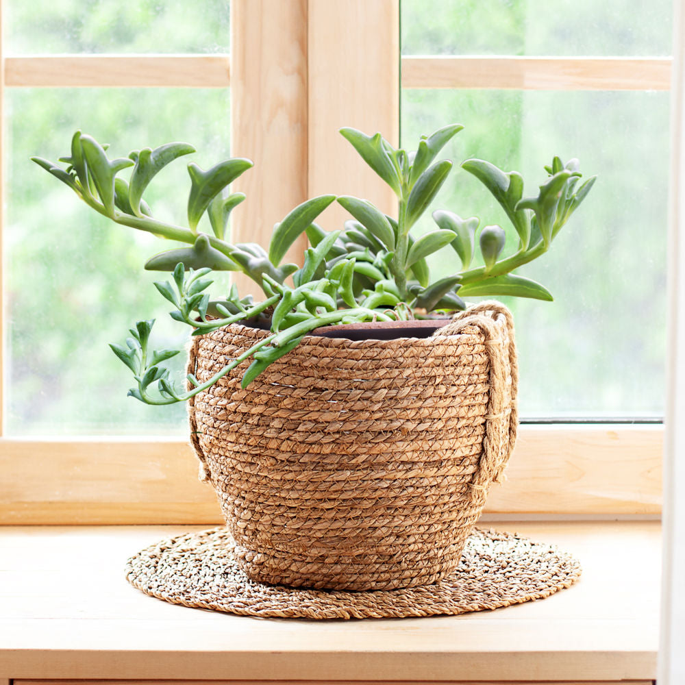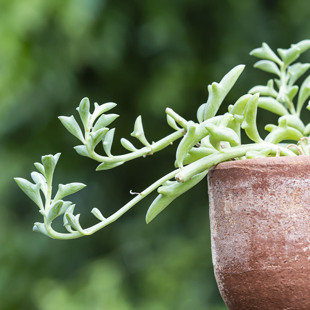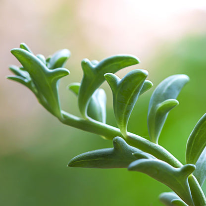 Flying Dolphins grows quickly with unusual tendrils reaching three feet in length! Pointed succulent leaves that resemble dolphins grow single-file along its cascading stems. In fall and winter, tiny off-white blossoms shaped like pompoms open and emit a cinnamon-like fragrance. String of Dolphins makes an excellent groundcover in warmer zones, and looks beautiful cascading over the edges of containers and hanging baskets in any part of the country. Includes one actively growing plant in a 4" grow pot.