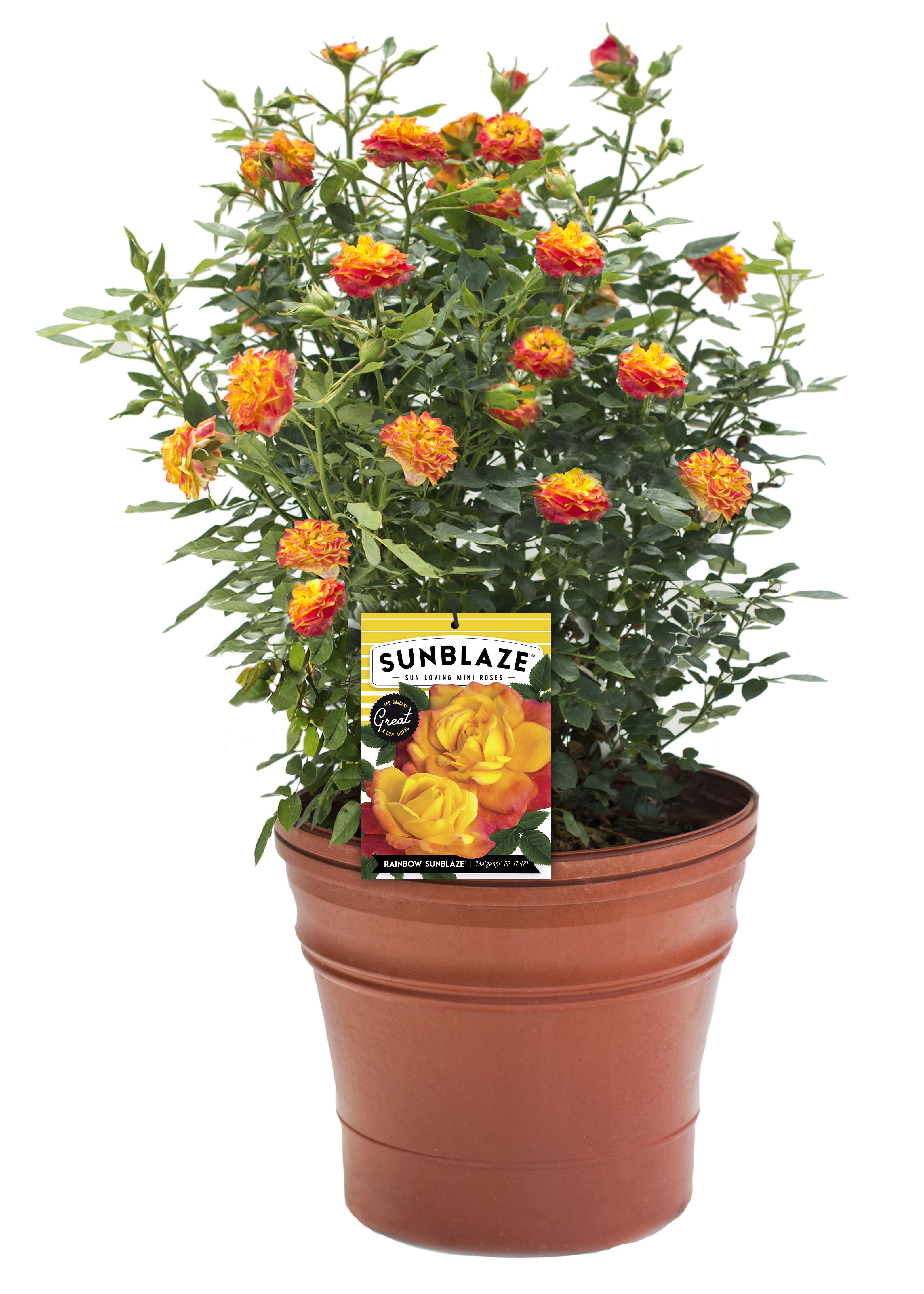 The Rainbow Sunblaze® Miniature Rose (Rosa 'Meigenpi') is a stunning addition to any garden, boasting an enchanting display of multi-colored blooms that transition gracefully from sunny yellow to vibrant orange-red. This petite treasure, reaching a height of just 1 to 2 feet, not only captivates with its beauty but is also remarkably resilient and hardy in zones 5 through 11. Although it is described as drought-tolerant, this rose truly flourishes with regular watering and thrives in rich, well-draining soil, especially when placed in containers. For the most breathtaking floral display, it craves full sunlight and offers a delightful low-maintenance option for small gardens and pots, gracing your landscape with its vibrant flowers from spring all the way into fall. Embrace the charm of the Rainbow Sunblaze® and elevate your outdoor space with its captivating blooms! This offer contains three actively growing plants in 3.25" grow pots.
